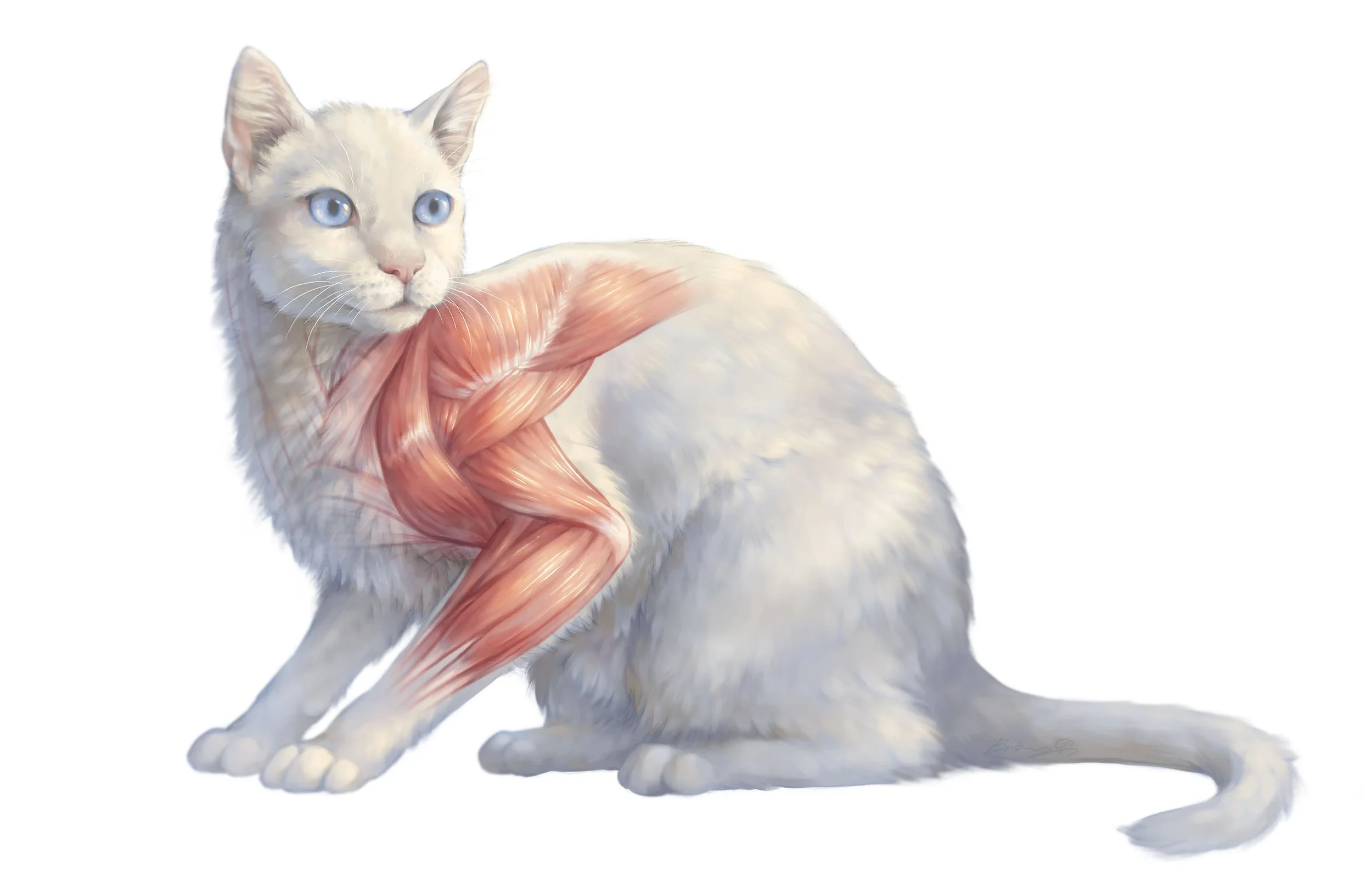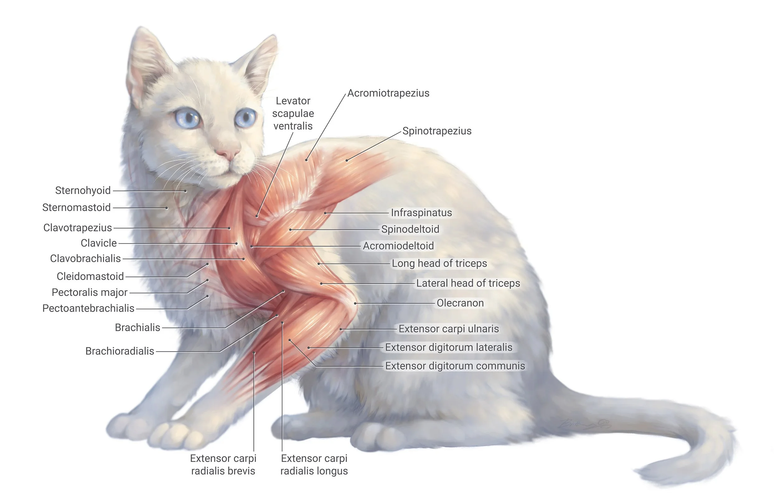 Most illustrations of cat forelimb muscular anatomy depict the cat from a lateral view with the leg extended. This illustration instead shows the cat in a natural and relaxed crouched position and, when combined with more standard depictions, gives students a better appreciation of how muscles drive movement and therefore how they look different in different positions. For example, the triceps are more relaxed, the clavobrachialis is flexed, and the infraspinatus is more easily visible.