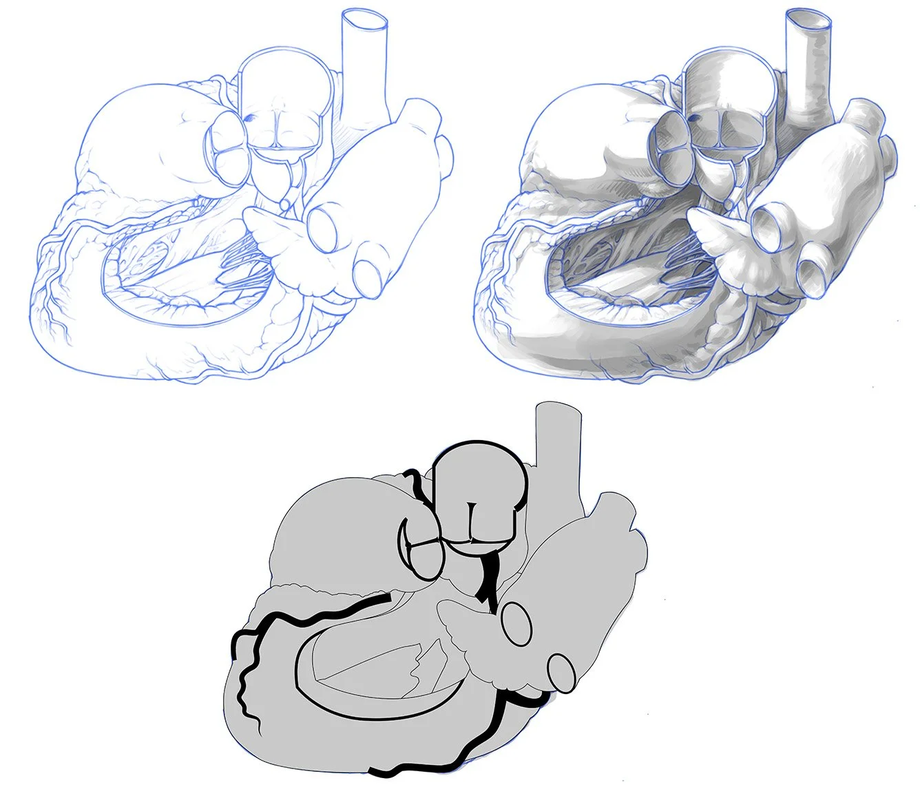 Using the 3D model of the heart as a base and ensuring details were accurate using my other references, I created the sketch and added preliminary shading in Adobe Photoshop. Then, I blocked out the shapes in Adobe Illustrator.