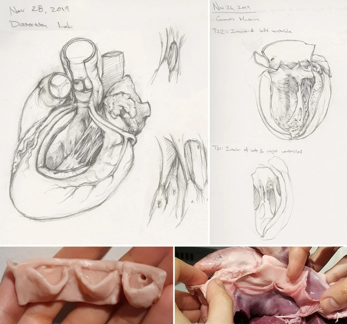To understand the finer details that the rough 3D model was unable to capture, I sketched a dissected cadaver’s heart and specimens from Grant’s museum, modeled the aortic cusps using clay, looked at a pig’s heart, and referenced illustrative and photographic atlases. This helped with things such as wall thickness, the trabeculae carnae, the cusps, and the mitral valve.