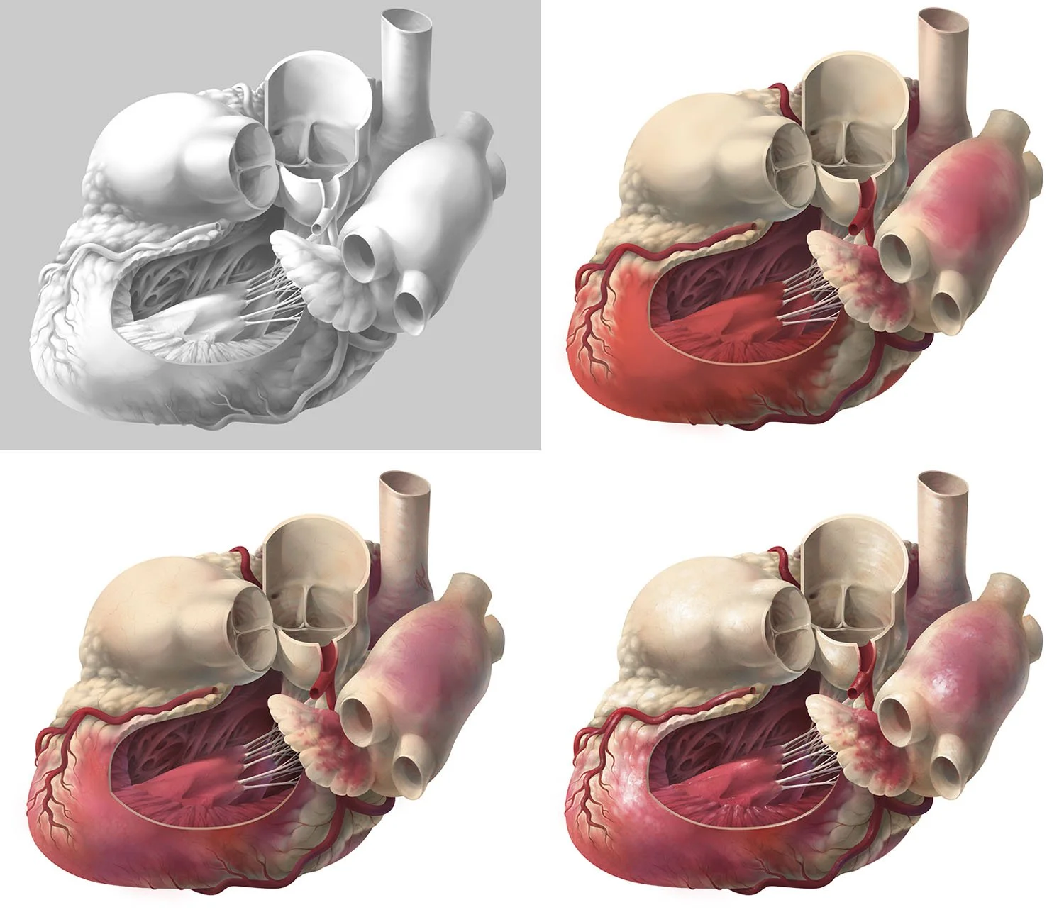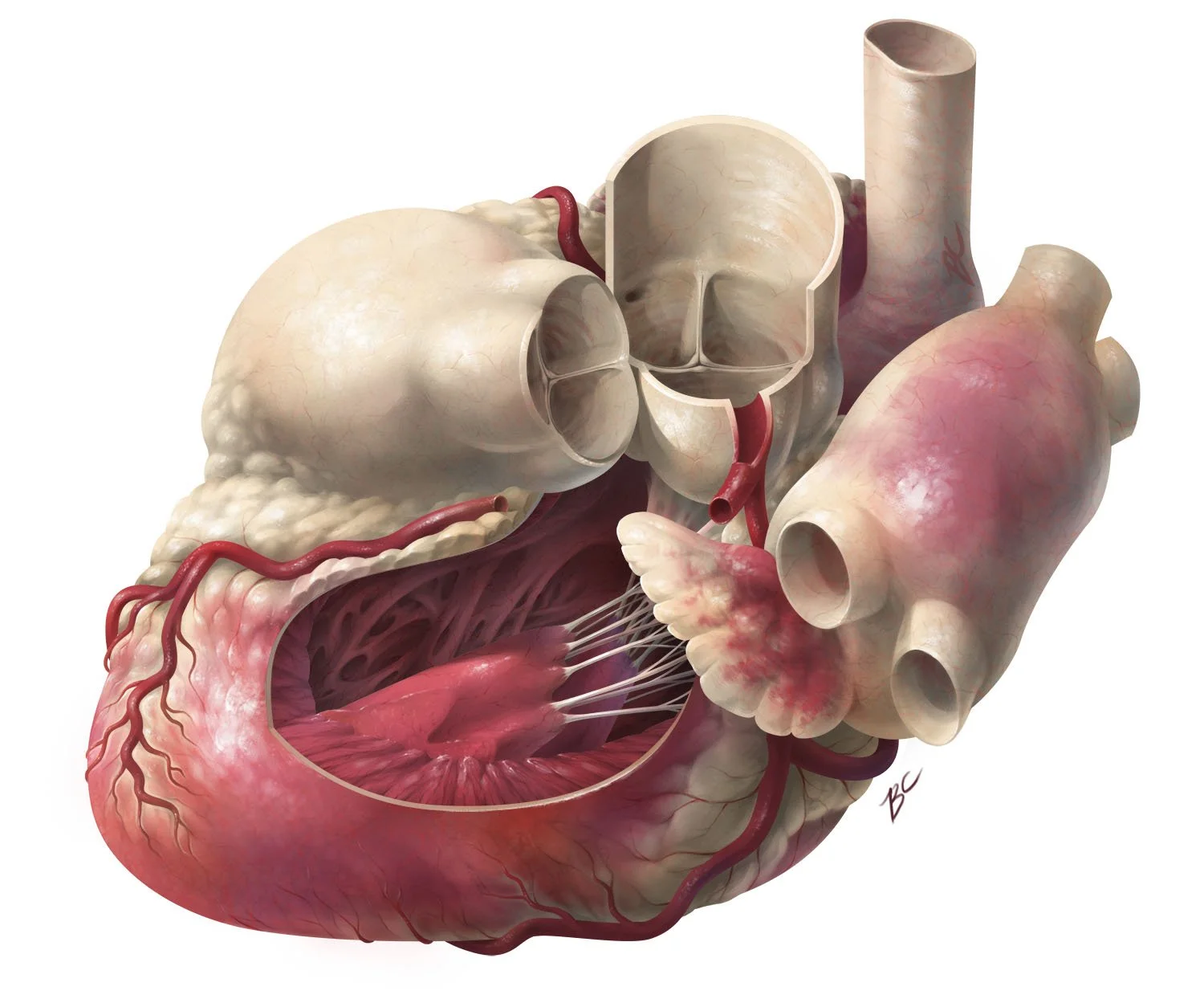 Anatomical illustrations usually depict standard views and cross-sections. The goal of this piece was to depict an organ from an unusual angle and with an unusual cut, which required 3D assets and a great deal of research. This posterolateral view of the heart shows the interior of the left ventricle, including the papillary muscles, tendinous cords, and trabeculae carnae, as well as the pulmonary and aortic cusps.