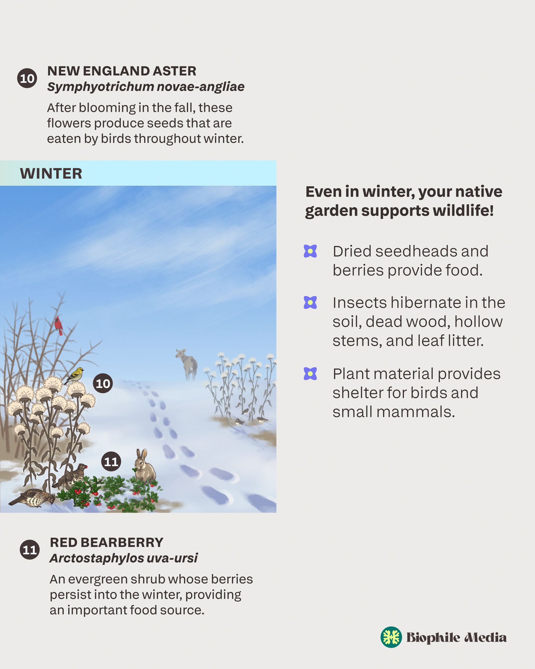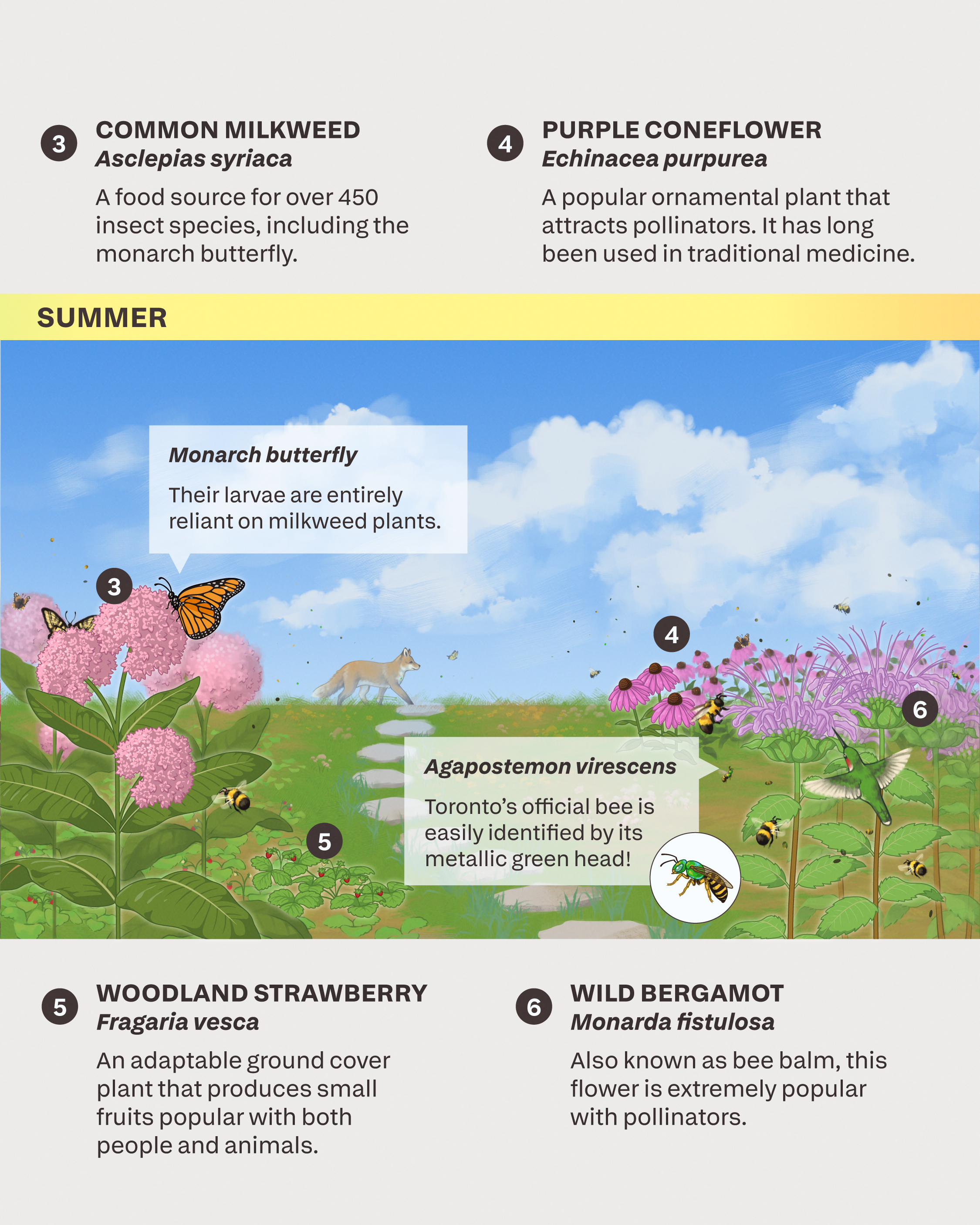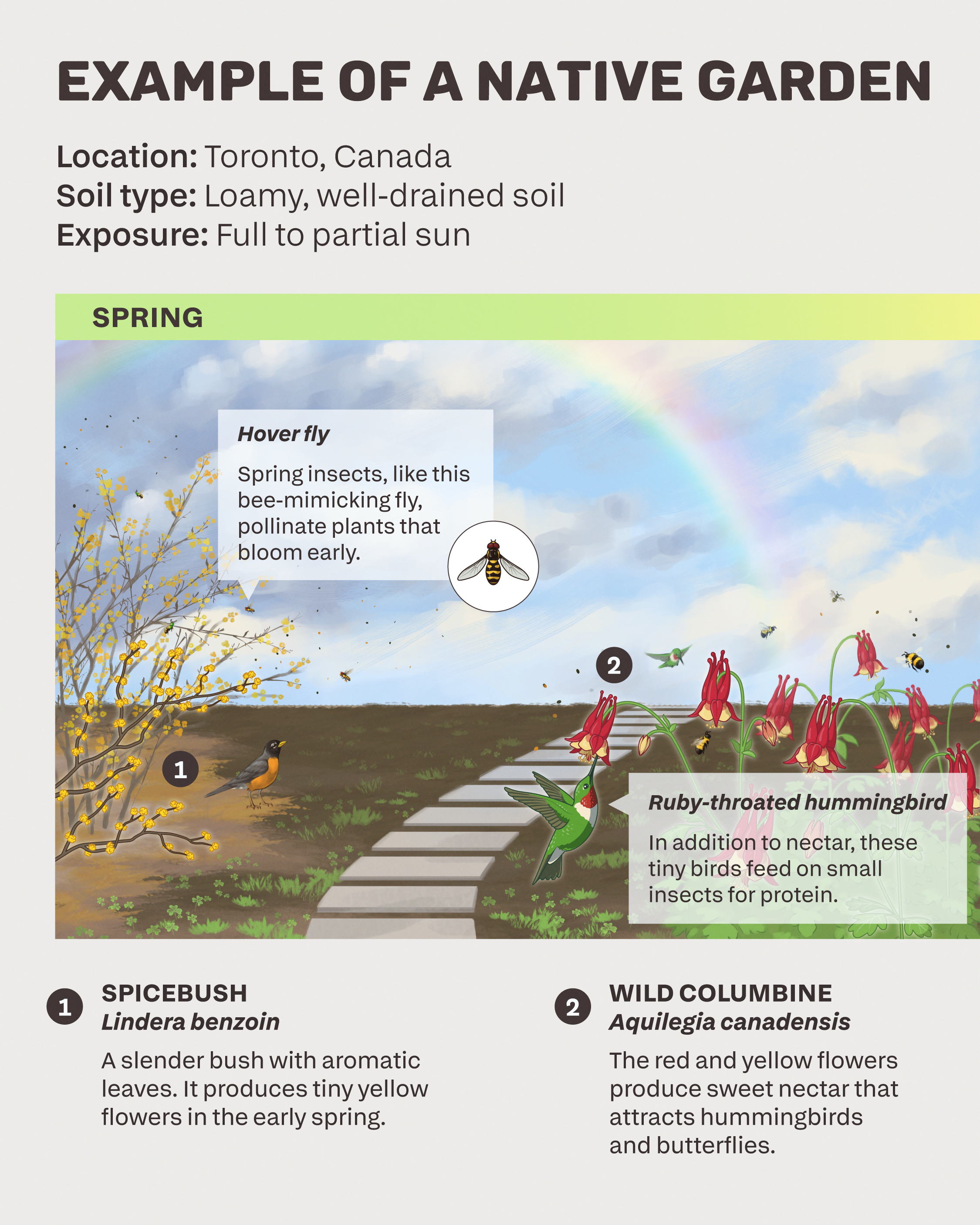 An excellent way of helping local biodiversity is to plant a native garden. This infographic teaches a general audience about the the benefits of a native garden and provides resources for planting one of your own. It also provides an example of a native garden in Toronto, Canada, showing how native plants provide food, nesting sites, and shelter for various pollinators throughout the seasons.
